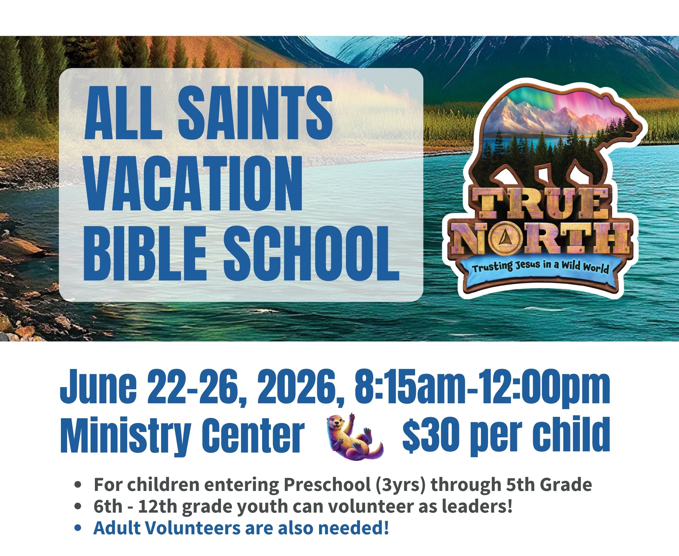 Youth volunteers are youth entering 6th-12th grade for the upcoming 2026-2027 school year. Youth are needed for set-up, clean-up crew, Bible story class, snack helpers, crafts, games, music, preschool help, and in the nursery. Youth volunteers are asked to be present from 8:00am - 12:00pm.