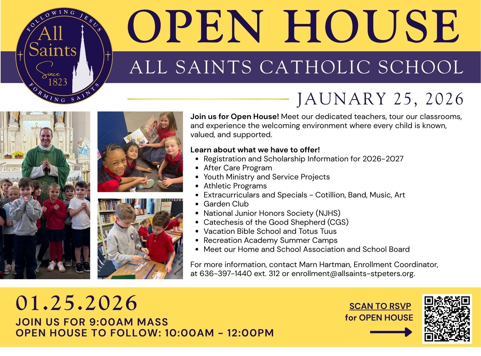 Don't miss this opportunity for a special tour of All Saints Catholic School! Our Open House will following the 9am Mass, from 10am-Noon. See you there!